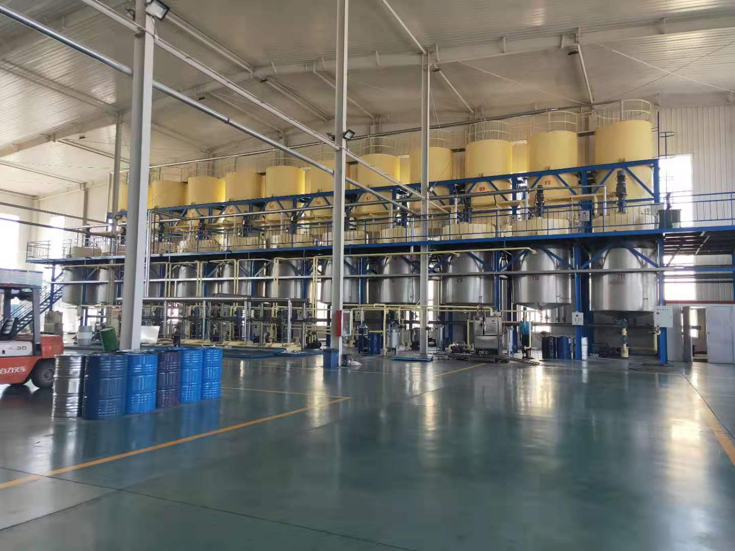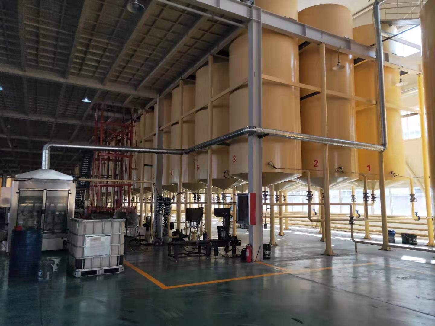 生产区位于厂内南侧,分调和区和罐装区,调和区内装有目前国内的脉冲调和设备及电控加热设备,罐装区内有多条成品自动罐装线,能保证四升,十八升等小包装产品成批次生产。
